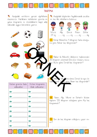 Aşağıdaki varlıkların gerçek ağırlıklarını Aşağıdaki bilgilerden faydalanarak çocukla-