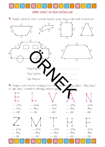 Aşağıda resimlerde verilen numaralı doğruları yatay, dikey ve eğik olarak sınıflandıralım.