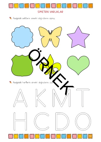 SİMETRİK VARLIKLAR Aşağıdaki şekillerin simetri doğrularını çiziniz. Aşağıdaki harflerin simetri doğrularını çiziniz. A K M T ÖRNEK H C D O 170
