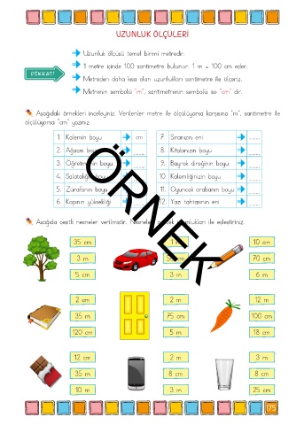 Aşağıdaki örnekleri inceleyiniz. Verilenler metre ile ölçülüyorsa karşısına “m”, santimetre ile