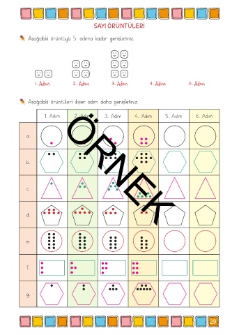 SAYI ÖRÜNTÜLERİ Aşağıdaki örüntüyü 5. adıma kadar genişletiniz. 1. Adım 2. Adım 3. Adım 4. Adım 5. Adım Aşağıdaki örüntüleri ikişer adım daha genişletiniz. 1. Adım 2. Adım 3. Adım 4. Adım 5. Adım 6. Adım a. b. ÖRNEK c. d. e. f. g. 29