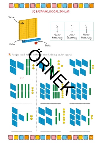 ÜÇ BASAMAKLI DOĞAL SAYILAR Yüzlük 2 1 5 Yüzler Onlar Birler Basamağı Basamağı Basamağı Onluk Birlik Aşağıda onluk taban blokları ile modellediğimiz sayıları yazınız. 342 ÖRNEK 6