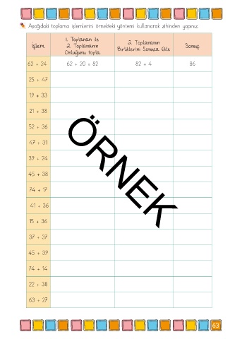 Aşağıdaki toplama işlemlerini örnekteki yöntemi kullanarak zihinden yapınız.