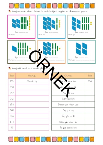 Aşağıda onluk taban blokları ile modellediğimiz sayıları ve okunuşlarını yazınız.