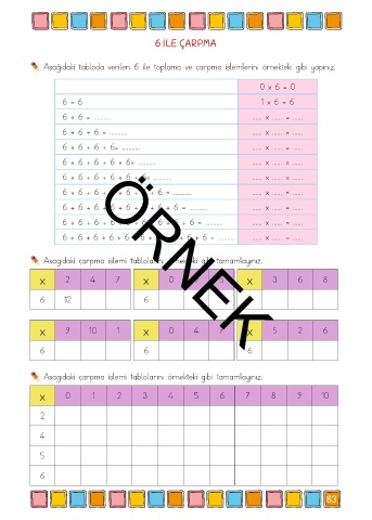 Aşağıdaki tabloda verilen 6 ile toplama ve çarpma işlemlerini örnekteki gibi yapınız.