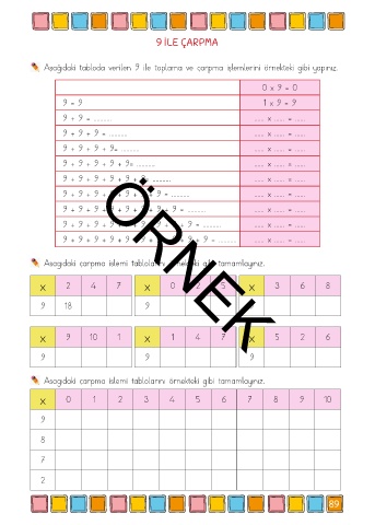 Aşağıdaki tabloda verilen 9 ile toplama ve çarpma işlemlerini örnekteki gibi yapınız.