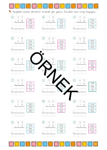 Aşağıdaki çarpma işlemlerini örnekteki gibi yapınız. Sonuçları mavi renge boyayınız.