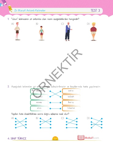 Zıt (Karşıt) Anlamlı Kelimeler TEST 3