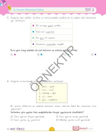 5. Aşağıda bazı şekiller verilmiş ve karşılarındaki cümlelerde eş anlamı olan kelimelere