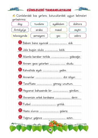 Cümlelerdeki boş yerlere, kutucuklardaki uygun kelimeleri