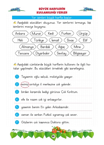 Aşağıdaki sözcükleri okuyunuz. Yer isimlerini kırmızıya, kişi