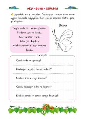 uygun renklerle boyayalım. Son olarak soruları metne göre