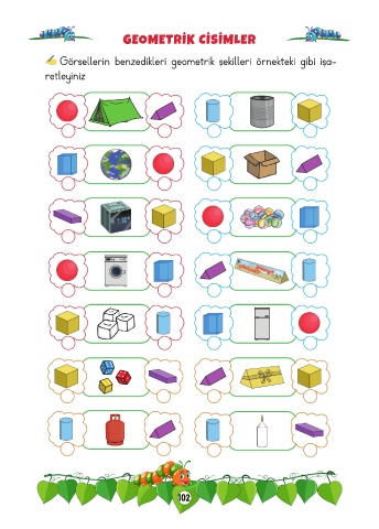 GEOMETRİK CİSİMLER Görsellerin benzedikleri geometrik şekilleri örnekteki gibi işa- retleyiniz 102