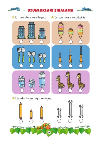 UZUNLUKLARI SIRALAMA En kısa olanı işaretleyiniz. En uzun olanı işaretleyiniz. Uzundan kısaya doğru sıralayınız. 114