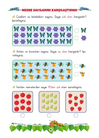 NESNE SAYILARINI KARŞILAŞTIRMA Çiçekleri ve kelebekleri sayınız. Sayısı çok olan hangisidir? İşaretleyiniz. Arıları ve kovanları sayınız. Sayısı az olan hangisidir? İşa- retleyiniz. Verilen nesnelerden sayısı 10’dan çok olanı işaretleyiniz. 19