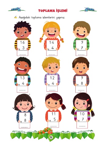 TOPLAMA İŞLEMİ Aşağıdaki toplama işlemlerini yapınız. 16 14 9 + 3 + 4 + 7 ........ ........ ........ 13 12 9 + 4 + 4 + 8 ........ ........ ........ 8 11 10 + 8 + 5 + 7 ........ ........ ........ 32