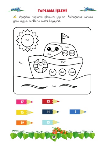 TOPLAMA İŞLEMİ Aşağıdaki toplama işlemleri yapınız. Bulduğunuz sonuca göre uygun renklerle resmi boyayınız. 9+4 7+8 13+6 3+6 8+2 10+7 8+9 7+3 10+3 7+6 13+2 7+4 12+1 8+5 1+9 8+2 6+4 5+4 17 17 13 13 15 15 11 11 9 9 19 19 10 10 33