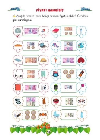 FİYATI HANGİSİ? Aşağıda verilen para hangi ürünün fiyatı olabilir? Örnekteki gibi işaretleyiniz. 4 52