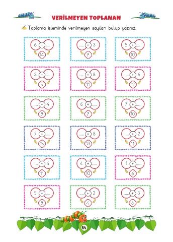 Toplama işleminde verilmeyen sayıları bulup yazınız.