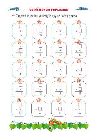 + Toplama işleminde verilmeyen sayıları bulup yazınız.