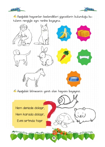 Aşağıdaki hayvanları beslendikleri yiyeceklerin bulunduğu ku- tuların rengiyle aynı renkte boyayınız. Aşağıdaki bilmecenin yanıtı olan hayvanı boyayınız. Hem denizde dolaşır, Hem karada dolaşır, Evini sırtında taşır. 71