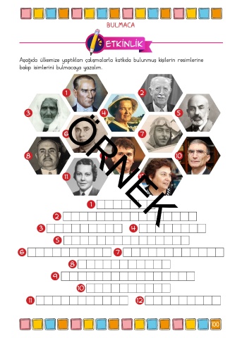 BULMACA Etkinlik Aşağıda ülkemize yaptıkları çalışmalarla katkıda bulunmuş kişilerin resimlerine bakıp isimlerini bulmacaya yazalım. 1 2 3 4 5 6 7 8 9 10 11 12 ÖRNEK 1 2 3 4 5 6 7 8 9 10 11 12 100