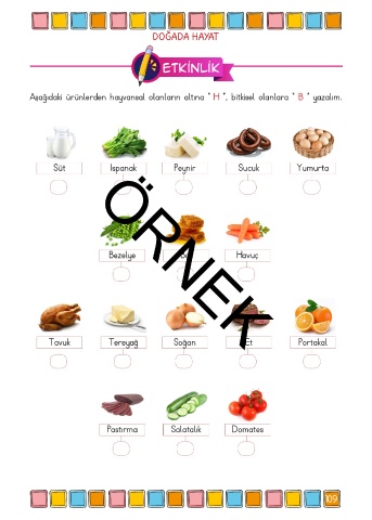 DOĞADA HAYAT Etkinlik Aşağıdaki ürünlerden hayvansal olanların altına “ H ”, bitkisel olanlara “ B ” yazalım. Süt Ispanak Peynir Sucuk Yumurta Bezelye Bal Havuç ÖRNEK Tavuk Tereyağ Soğan Et Portakal Pastırma Salatalık Domates 109