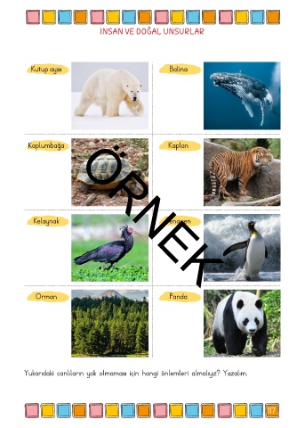 İNSAN VE DOĞAL UNSURLAR Kutup ayısı Balina Kaplumbağa Kaplan Penguen Kelaynak ÖRNEK Orman Panda Yukarıdaki canlıların yok olmaması için hangi önlemleri almalıyız? Yazalım. 117