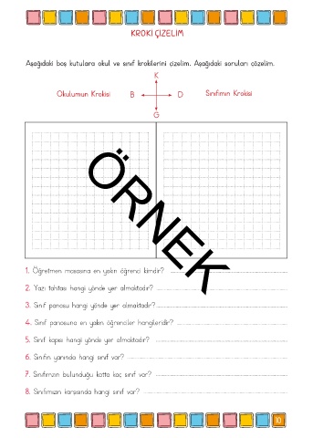 Aşağıdaki boş kutulara okul ve sınıf krokilerini çizelim. Aşağıdaki soruları çözelim.