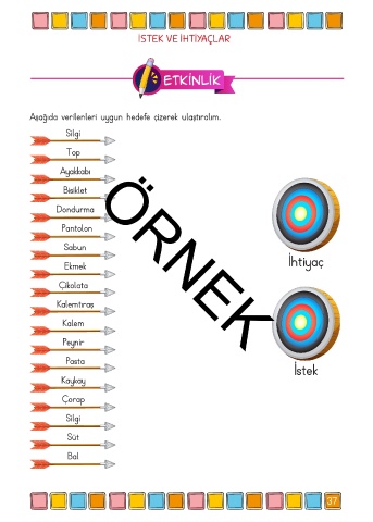 İSTEK VE İHTİYAÇLAR Etkinlik Aşağıda verilenleri uygun hedefe çizerek ulaştıralım. Silgi Top Ayakkabı Bisiklet Dondurma Pantolon Sabun İhtiyaç Ekmek Çikolata Kalemtıraş ÖRNEK Kalem Peynir Pasta İstek Kaykay Çorap Silgi Süt Bal 37