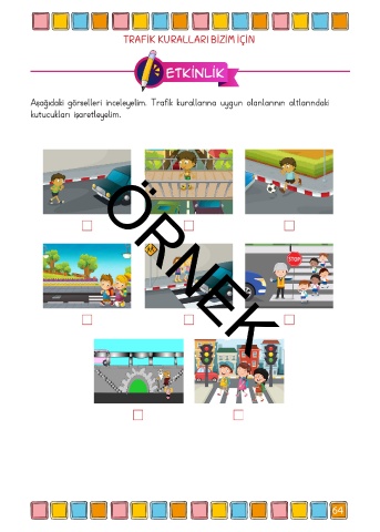 TRAFİK KURALLARI BİZİM İÇİN Etkinlik Aşağıdaki görselleri inceleyelim. Trafik kurallarına uygun olanlarının altlarındaki kutucukları işaretleyelim. ÖRNEK 64