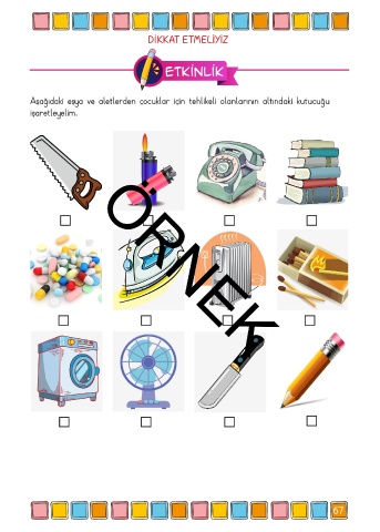 DİKKAT ETMELİYİZ Etkinlik Aşağıdaki eşya ve aletlerden çocuklar için tehlikeli olanlarının altındaki kutucuğu işaretleyelim. etmemeliyiz. ÖRNEK kullanmamalıyız. 67