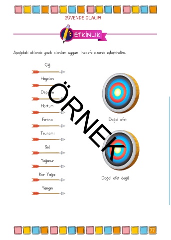 GÜVENDE OLALIM Etkinlik Aşağıdaki oklarda yazılı olanları uygun hedefe çizerek eşleştirelim. Çığ Heyelan Deprem Hortum Fırtına Doğal afet Tsunami ÖRNEK Sel Yağmur Kar Yağışı Doğal afet değil Yangın 77