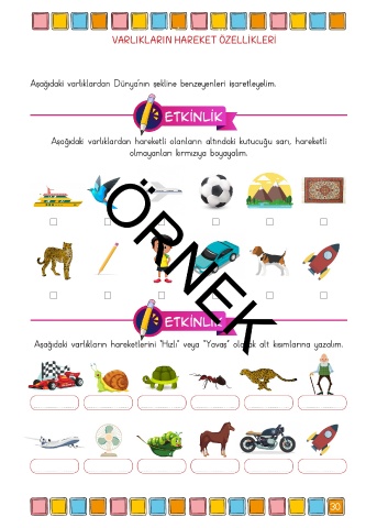 Aşağıdaki varlıklardan hareketli olanların altındaki kutucuğu sarı, hareketli