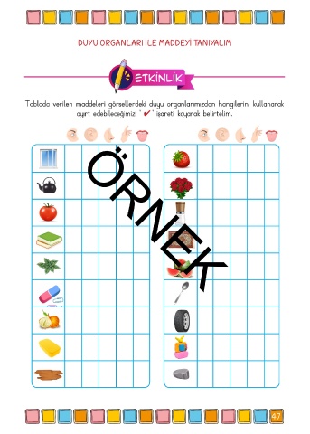 Maddeyi Tanıyalım DUYU ORGANLARI İLE MADDEYİ TANIYALIM Etkinlik Tabloda verilen maddeleri görsellerdeki duyu organlarımızdan hangilerini kullanarak ayırt edebileceğimizi ‘ 4 ‘ işareti koyarak belirtelim. ÖRNEK 47