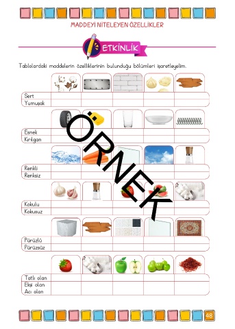 MADDEYİ NİTELEYEN ÖZELLİKLER Etkinlik Tablolardaki maddelerin özelliklerinin bulunduğu bölümleri işaretleyelim. Sert Yumuşak Esnek Kırılgan Renkli ÖRNEK Renksiz Kokulu Kokusuz Pürüzlü Pürüzsüz Tatlı olan Ekşi olan Acı olan 48